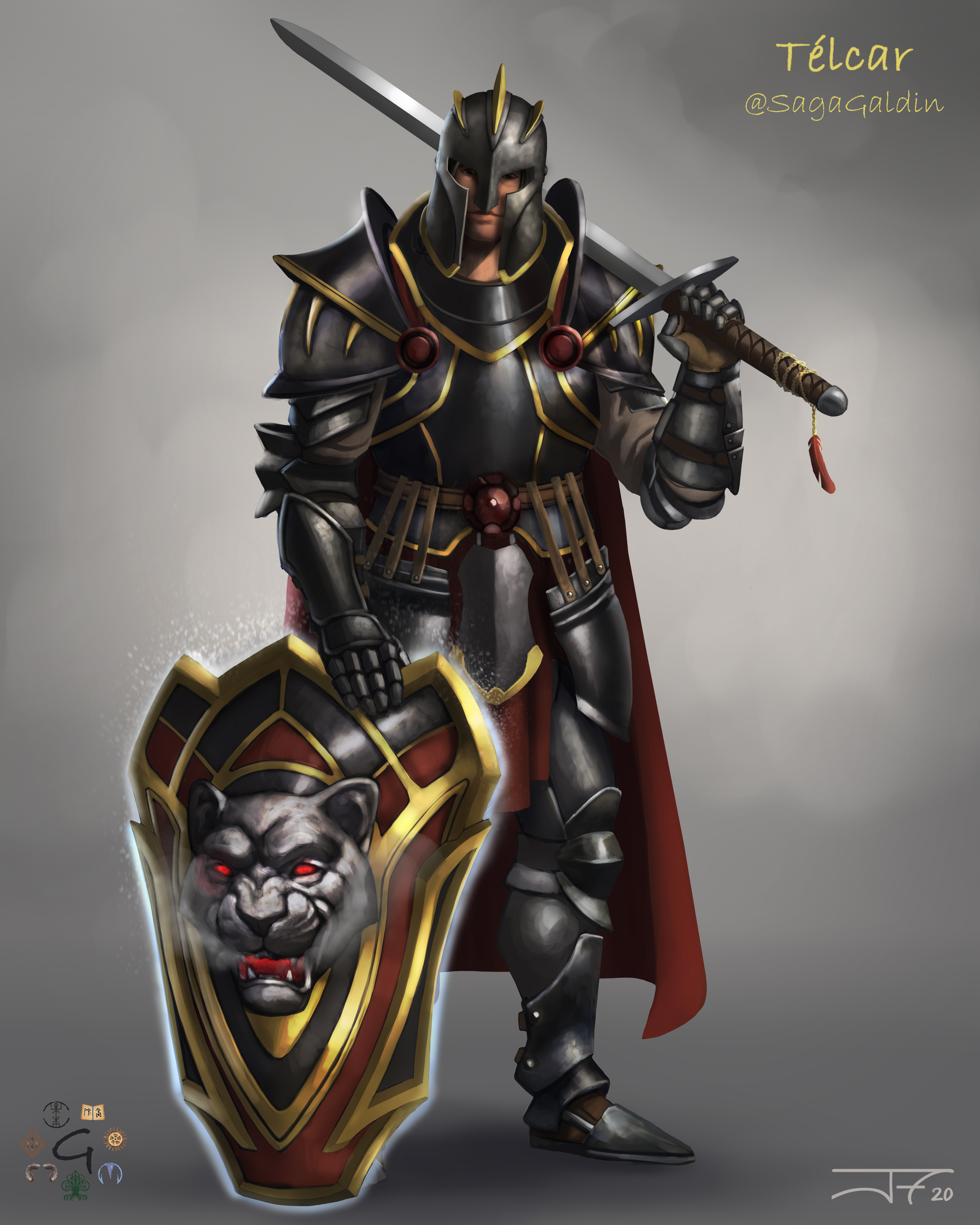 Aquella catástrofe atrajo a centenas de bandidos a Forn, saqueando lo poco que les quedaba, aprovechando su vulnerabilidad, pero Khan, su líder, les defendía con gran esmero, a pesar de su avanzada edad, que le jugaba malas pasadas. En una de las incursiones, Khan se vio superado en número, durante una escaramuza, quedó malherido e incapaz de mantenerse en pie, lograron separarle de su resplandeciente y majestuoso escudo, que tras un fuerte golpe le fue imposible hacerse de nuevo con él, quedando este desvalido en el suelo, indefenso y rodeado por una decena de enemigos. Télcar, cansado de las injusticias y de la vandálica conducta que les invadía, no ignoró aquella situación y corrió en su auxilio, agarrando aquel escudo, con el que defendió a Khan, a Forn y a todos sus vecinos y amigos, pues su gran fuerza física le dotaba de una gran habilidad defensiva y ofensiva insólita con aquel escudo. Khan, incrédulo a lo que estaba presenciando, no pasó por alto sus grandes cualidades, ofreciéndole una alternativa a su vida, que parecía estar rota desde que perdió su granja. Se comprometió a entrenarlo y a prepararlo para convertirlo en un gran paladín, defensor y cazador de Forn. Sin dudarlo un instante, y durante muchos años, se entrenó hasta convertirse en un talentoso guerrero, equipado con el escudo de Khan, el cual le había regalado, en una muestra de gratitud por su esmero en la defensa y por la brillantez en sus cualidades como paladín.